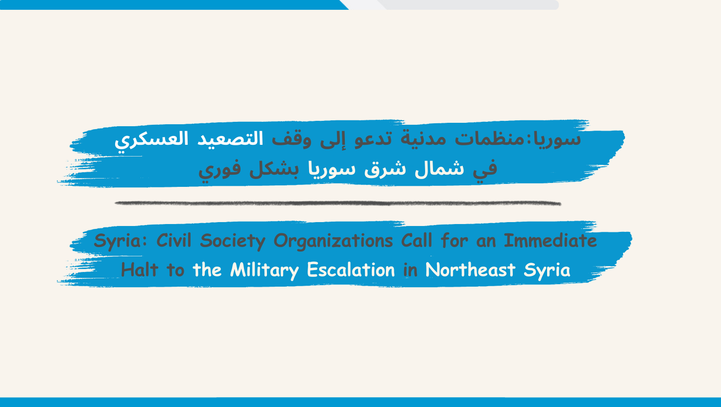 تعرب المنظمات السورية الموقعة على هذا البيان عن قلقها الشديد من تصاعد العمليات العسكرية في شمال شرق سوريا/الجزيرة السورية، وتدعو إلى الوقف الفوري لإطلاق النار ووقف انتهاكات القانون الإنساني الدولي والقانون الدولي لحقوق الإنسان، وتطالب جميع الأطراف بالعودة إلى اتفاق 10 آذار/مارس 2025، الموقع برعاية أمريكية بين الحكومة السورية الانتقالية من جهة وقوات سوريا الديمقراطية/قسد من جهة أخرى.