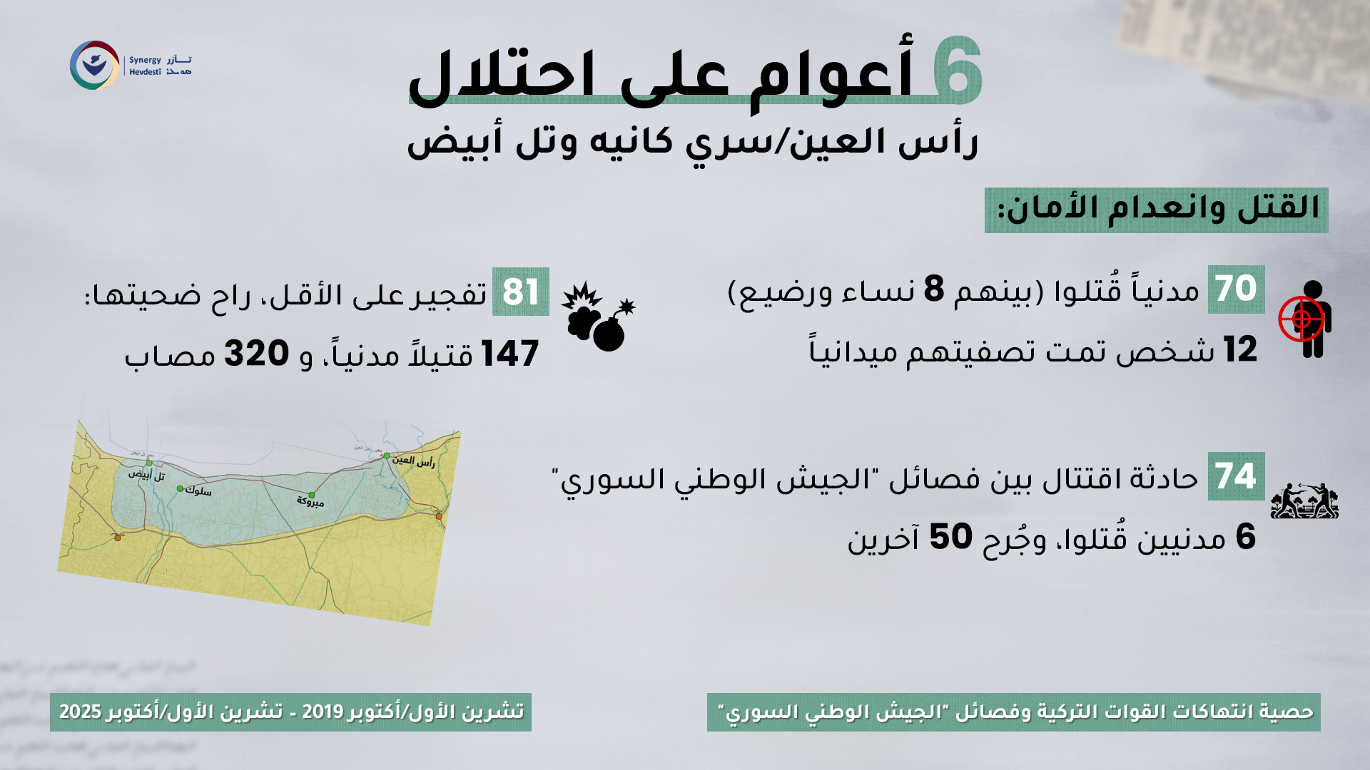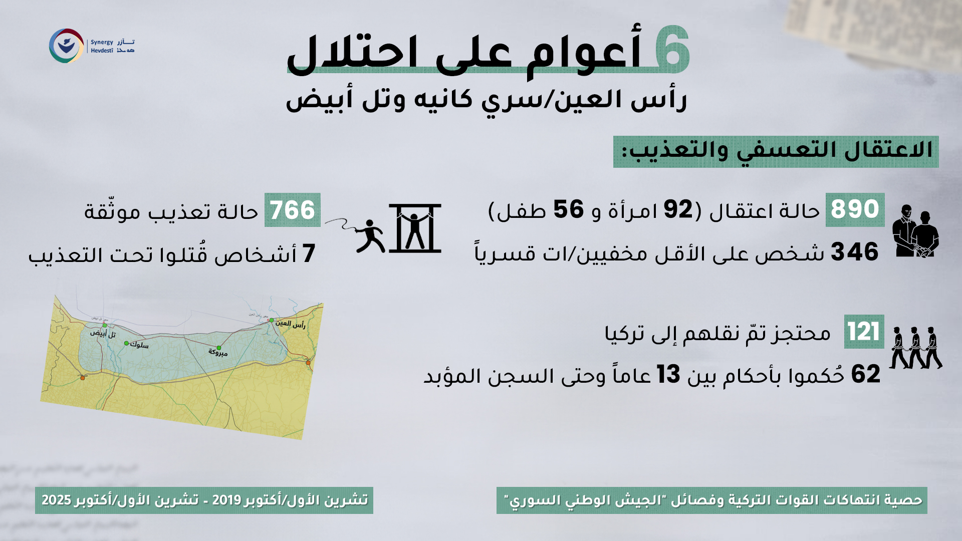 منذ احتلال مناطق رأس العين/سري كانيه وتل أبيض في تشرين الأول/أكتوبر 2019، وثّقت «تآزر» مقتل 70 مدنياً، بينهم 8 نساء وطفل رضيع، واعتقال ما لا يقلّ عن 890 شخصاً، بينهم 92 امرأة و56 طفلاً، على يد القوات التركية وفصائل «الجيش الوطني السوري» المدعومة منها.