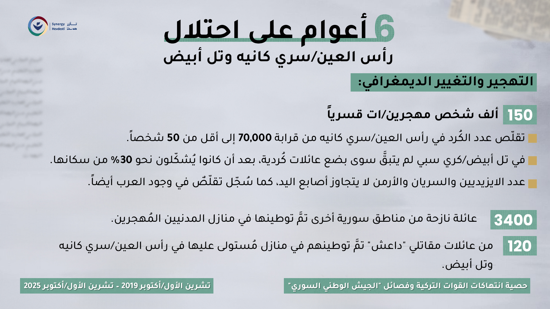 أفضى الاحتلال إلى استمرار تهجير أكثر من 150 ألفاً من السكّان الأصليين لمناطق رأس العين/سري كانيه وتل أبيض، مقابل توطين أكثر من 3,400 عائلة نازحة من مناطق سورية أخرى في منازل المُهجّرين قسراً.