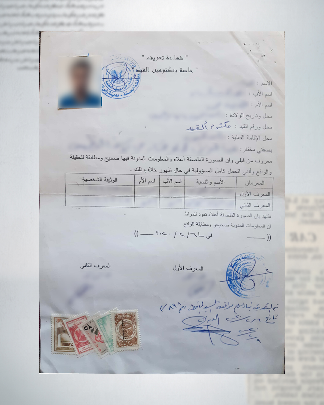 شهادة التعريف التي حملها الضحايا من فئة “مكتومي القيد”، وهي تصدر عادةً عن “مختار الحيّ” بعنوان «شهادة تعريف خاصة بـ مكتومين القيد»، وتشترط حضور شاهدين/مُعرِّفين يقرّان بمعرفتهما لصاحبها. هذه الشهادة وظيفتها التعريف فقط ولا تُثبت أي شخصية قانونية، إذ يبقى “مكتومو القيد” خارج السجلّ المدني كلياً، بلا رقمٍ مدني، وغير معترف بهم رسمياً.