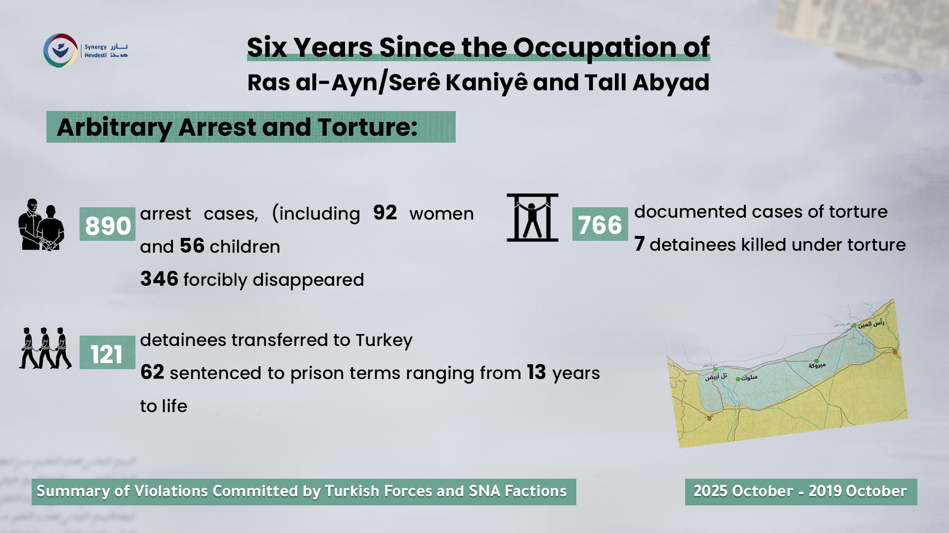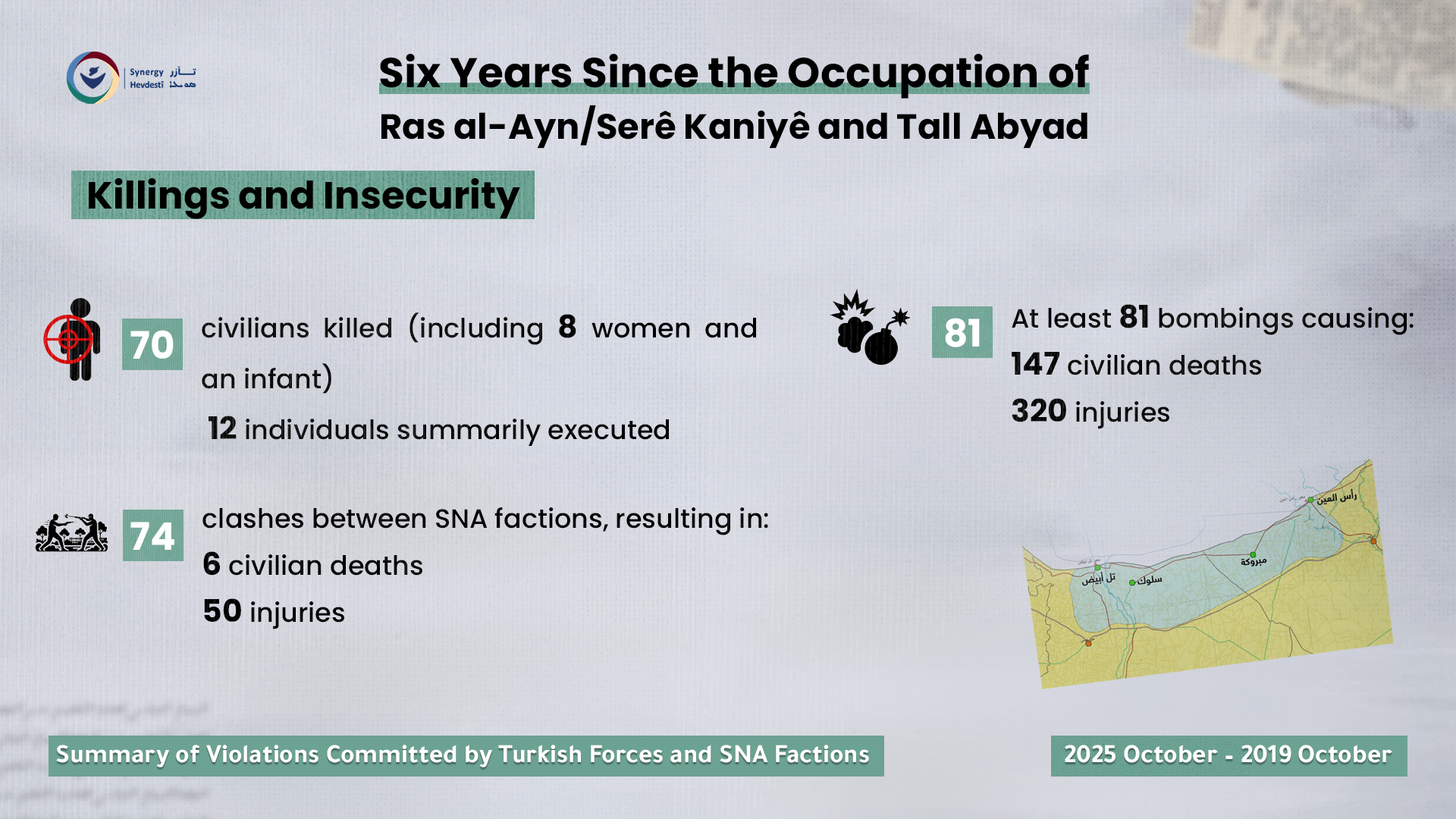 Since the occupation of Ras al-Ayn/Serê Kaniyê and Tall Abyad in October 2019, Synergy has documented the killing of 70 civilians—including 8 women and an infant—and the arrest of at least 890 persons, including 92 women and 56 children, by Turkish forces and Turkish-backed SNA factions.