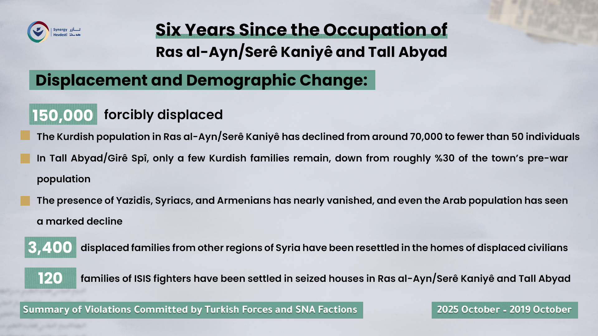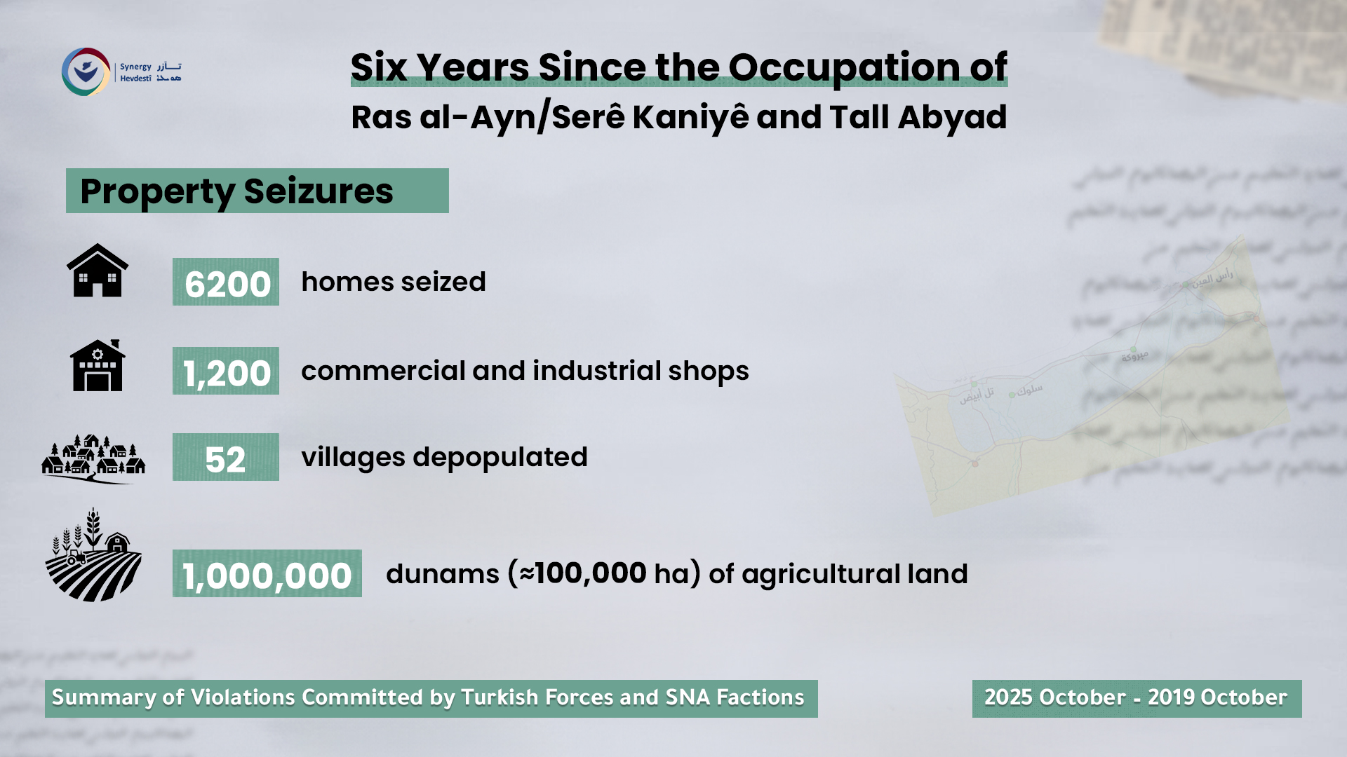 Since October 2019, the areas of Ras al-Ayn/Serê Kaniyê and Tall Abyad/Girê Spî—under the control of Turkish forces and SNA factions—have witnessed systematic and widespread patterns of violations against original inhabitants, including Kurds, Arabs, Armenians, Syriacs/Assyrians, Yazidis, Chechens, and others.