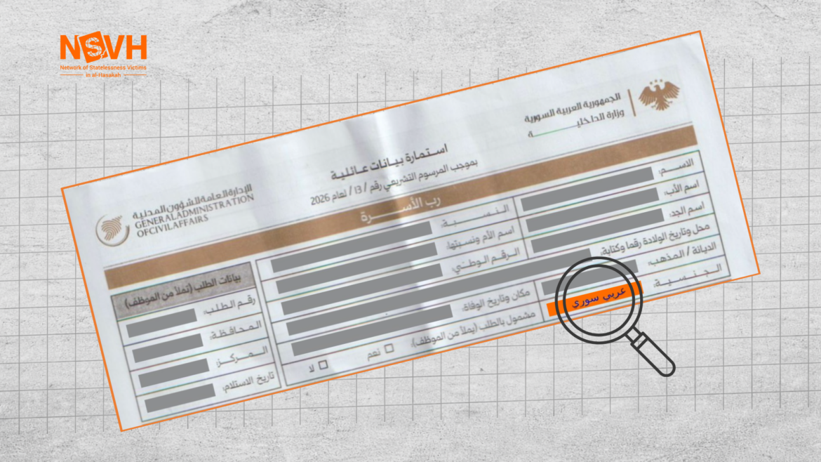 The Network of Statelessness Victims in al-Hasakah (NSVH) has documented, through field monitoring at nationality application centres across the governorate, recurring cases in which Kurdish applicants are registered in official forms as “Syrian Arab.” These incidents have sparked widespread concern among Kurdish applicants and raised serious questions regarding compliance with Decree No. 13 of 2026.